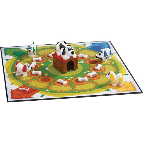 Help the puppies find their bones! Press on the electronic barking dog he will bark the number of spaces you move (1, 2 or 3). When your puppy lands on a space beside a bone, he can pick it up using his magnetic nose. If the color of the bone matches your puppy, you get to move it to your doghouse! The first to find 3 matching bones wins! For 2-4 players. Contents: Game board, 4 puppies, 1 electronic barking dog, 12 bones, game rules.