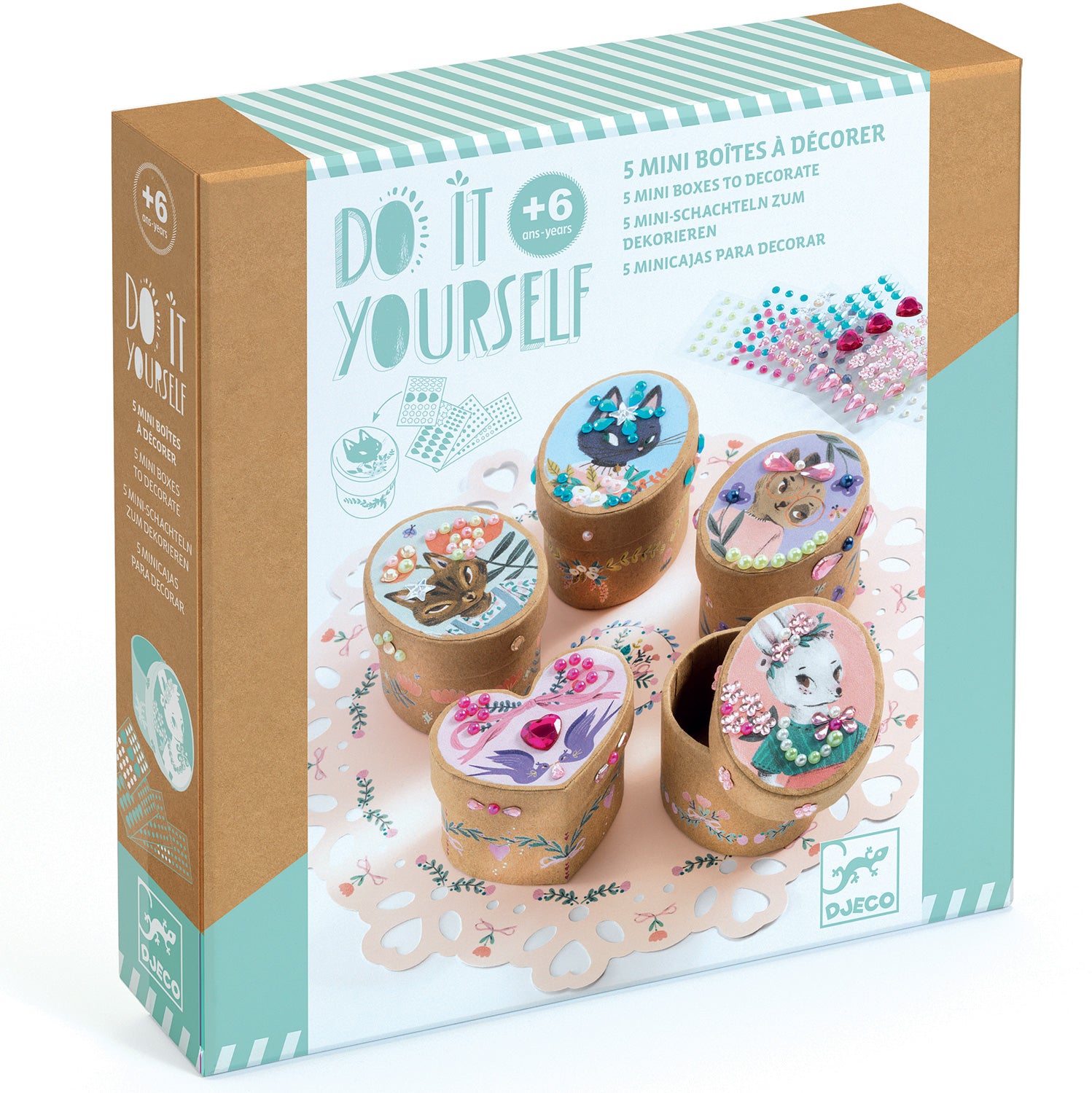 Kids love to collect tiny things. But where do they put it all? Here's an adorable craft solution: decorate 5 mini trinket boxes using over 200 self-adhesive gemstones! We love the vintage style animal designs, and that it even comes with a paper doily for display.
