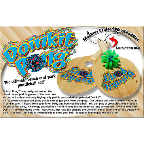 Doinkits can be hit a substantial distance. They can be played on a tennis court or at the beach. The Doinkit is completely waterproof. It can be hit with a tennis racket, a baseball bat, any paddle, your hand, and yes even the finely crafted Doinker that comes in the set. Doinkit can be played at an extremely fast pace. You can get an amazing workout in a very short period of time! OR, it can also be casually "Doinked" back and forth in a very small space. The control that you have is unlike any other racket game you have ever played.