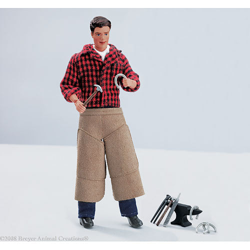 No hoof, no horse! Breyer's fully articulated 8" farrier figure comes with anvil, hammer, file, nippers, and set of horseshoes. Recognized by the American Farrier's Association.