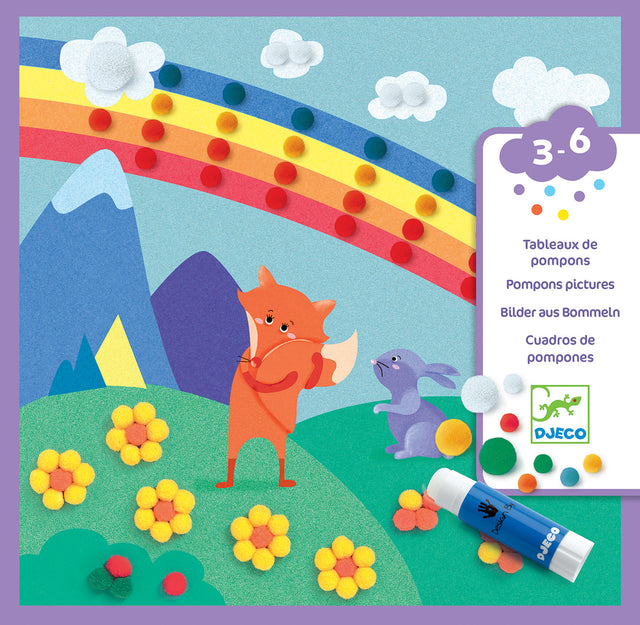 Contents:4 illustrated boards 200 x 200 mm. Approx. 330 pom-poms. 2 different pump diameters (8 and 15 mm). 1 tube of glue. 1 colour step-by-step booklet.