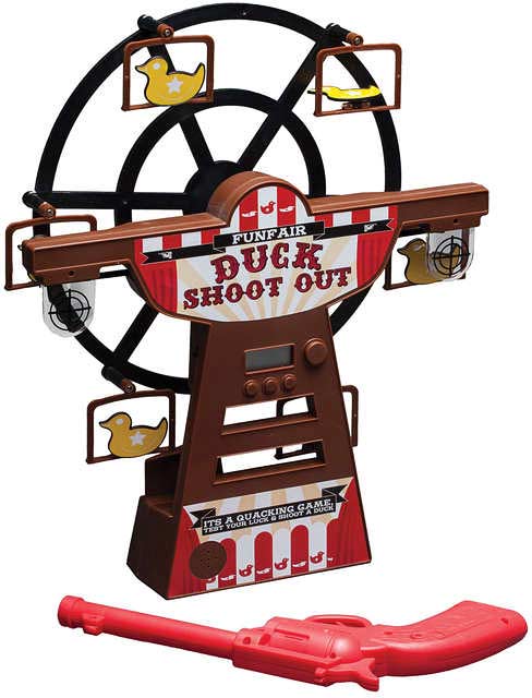 This Ferris Wheel Duck Shoot game requires 4 AA and 2 AAA batteries not included. Fun shooting gallery with infrared pistol. Duck targets will drop down when shot. Your score is kept on the LCD display. Ages 8+.