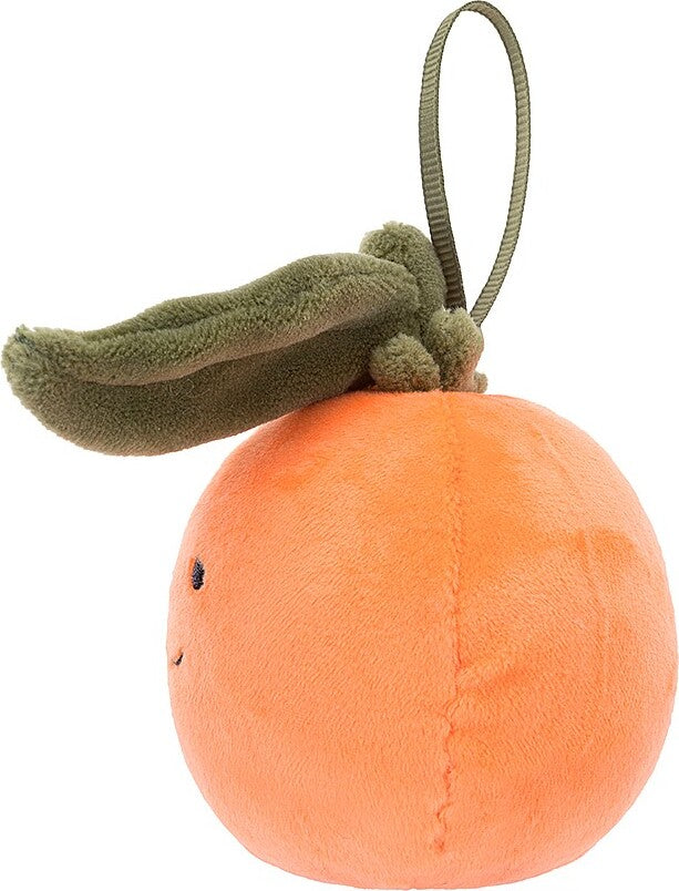 Festive Folly Clementine is a zingy addition to any Christmas tree! This plump orange pal has a welcoming smile, green suedette stalk and stitch-detail leaves, and a neat loop of grosgrain ribbon. A kooky fruit full of vitamin glee!