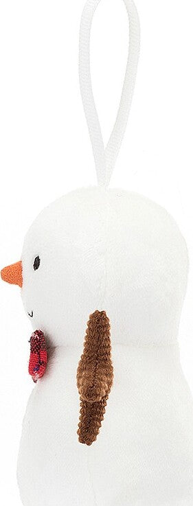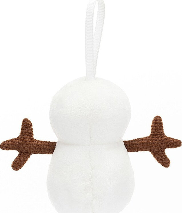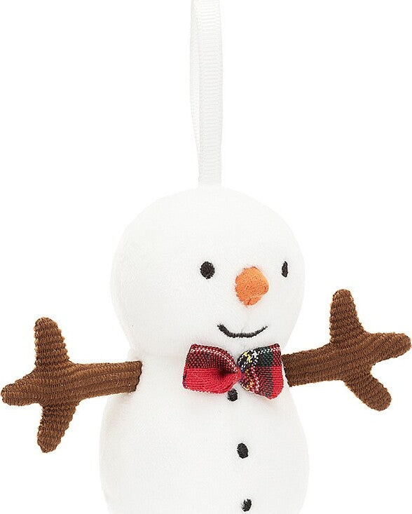 Festive Folly Snowman is marshmallow-soft in gentle cream fur. This playful tree pal has a tartan bow-tie, stitched coal buttons and suedette carrot nose. With a snowy ribbon for hanging on the tree and chocolate cord arms held wide for hugs, this snowman is anything but frosty!