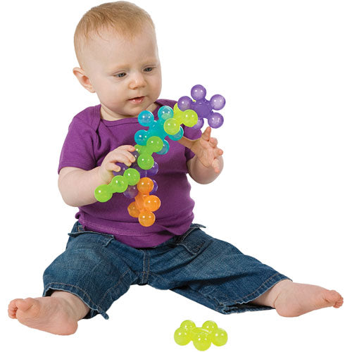 Push, pull motor skill game for infants.Brightly colored, textured snaps with faces!Stackable jar of 14 pieces.