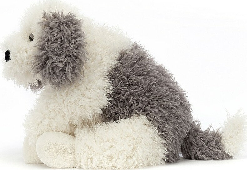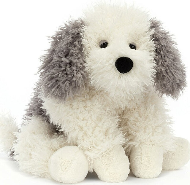 Normally only little dogs sit on laps, but we'll make an exception for Floofie Sheepdog! This tumbly cloud of scruffled softness is too adorable not to hug! With tussled vanilla fur, flopsy grey ears, ice-cream paws and a bobbly black nose, our perky pup is always making friends!