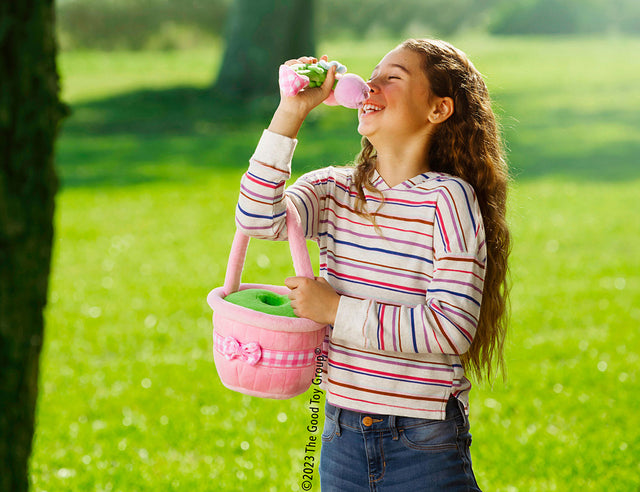 Cuddle bud gets literal with this soft, huggable flower basket plush. The trio of pastel flowers are removable from the 7 inch wide pink basket which features a gingham ribbon and bow. Little gardeners will especially love the adorable faces embroidered on their new flower buds!