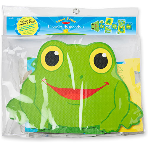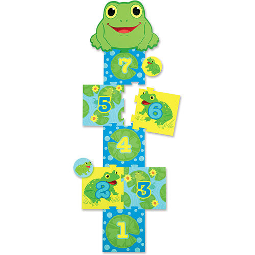 Colorful lily pads and frogs make every jump exciting in this hopscotch set! Eight jigsaw foam pieces snap together to make a simple, padded hopping course that's ideal for indoor or outdoor use. Lay it anywhere the soft pieces won't harm floors! Then just separate the pieces at the end of the game and store them away until next time. Comes with complete game instructions.