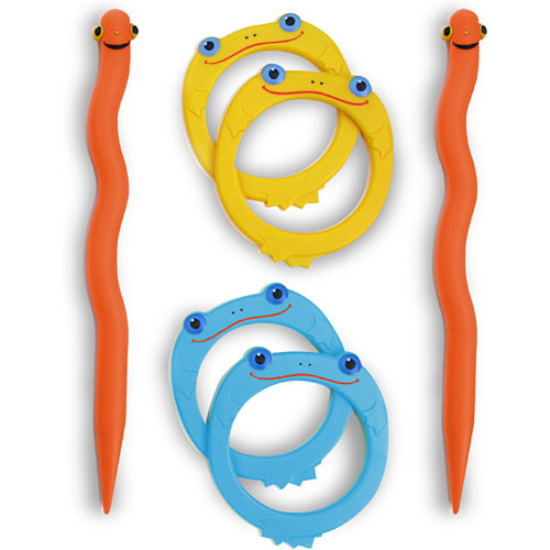 Two teams of froggy rings and two worm stakes add personality and pizzazz to this classic backyard game. The bright colors and sturdy materials of this ring toss set will make it a family favorite!