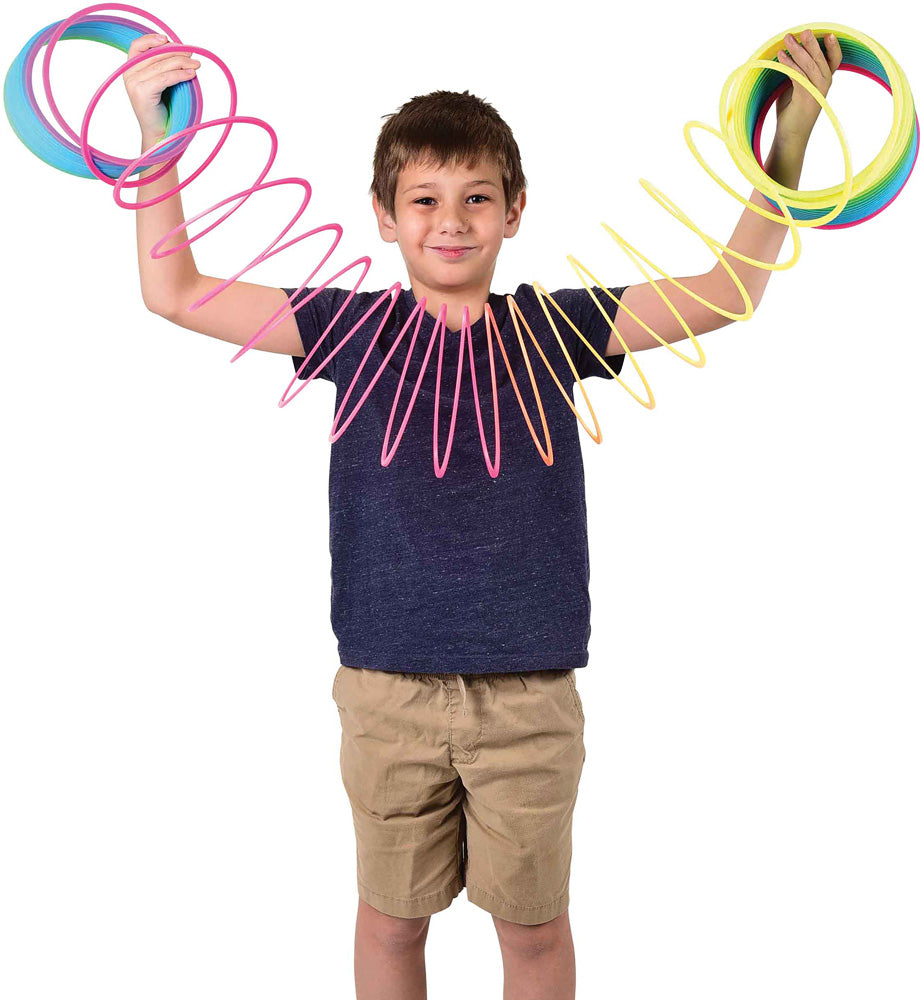The giant rainbow springy sensation just got bigger and brighter. Measuring 6" and featuring vibrant colors, this coil toy is a sight to behold as you launch it down the stairs. Made from quality, non-toxic materials, it can stretch a long way and bounce back into shape with ease. We say, "spring on" for endless fun!
