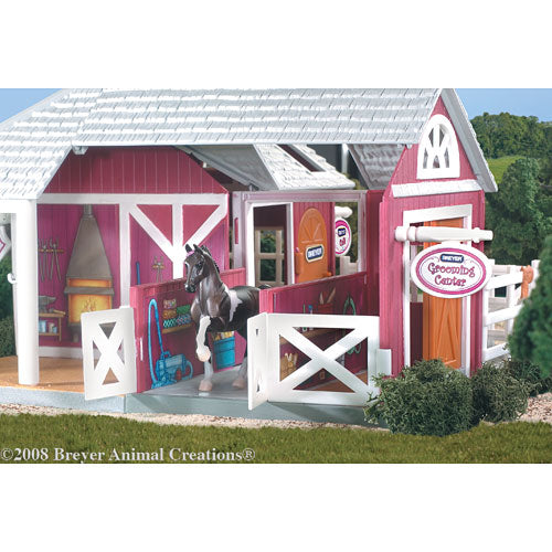 Give your horses a day of beauty and pampering at the Stablemates Grooming Center and Cafe. Start off with a good brushing, enjoy a soothing bath, and end the day with a visit to the farrier for the prettiest toes in town! Set includes a Stablemates Tennessee Wlaking Horse, cash register, counter and picnic table with umbrella. (Farrier and girl not included)