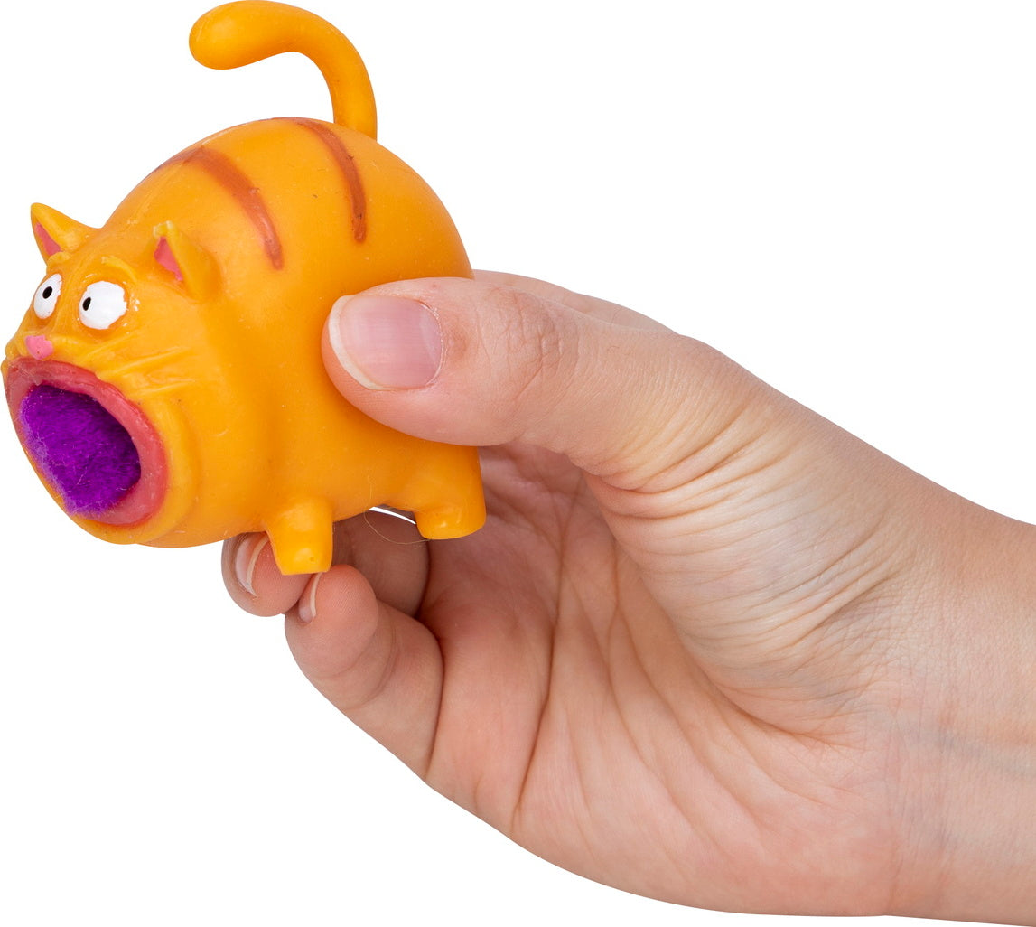 This Kitty has a hairball! Load your new feline friend with a soft pom pom hairball, then give them a squeeze and HACK! Their hairball shoots across the room, or at a funny friend. Perfect for endless amusement, and a great addition to any gift!