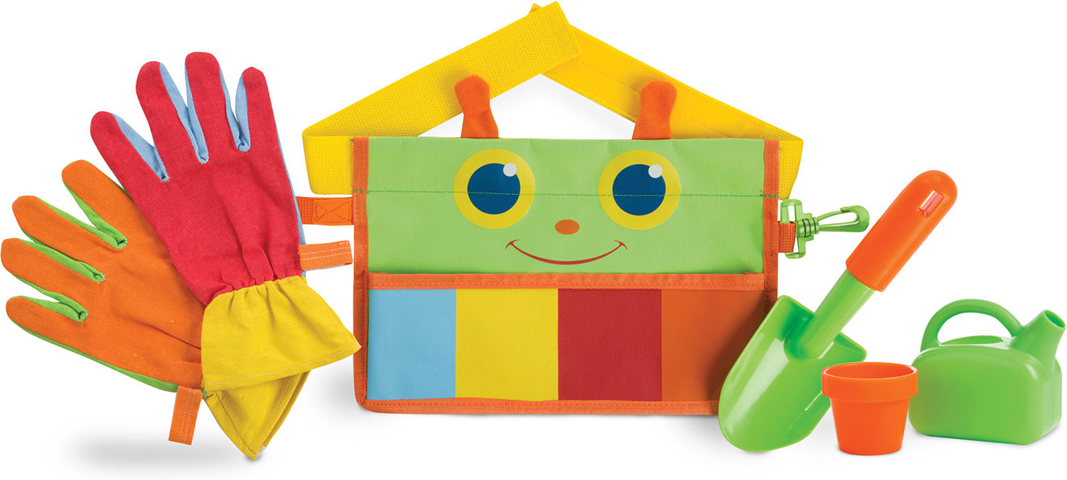 Young gardeners will love using these child-size tools to care for plants, veggies, and all sorts of growing things! The five-piece set-featuring cheerful bug Happy Giddy-includes a sturdy tool belt with adjustable self-stick closure and pocket, gardening gloves, trowel, watering can, and plant pot. Self-stick tabs make it easy to attach the gloves and watering can to the belt, and the generously sized pocket leaves plenty of room for other tools. Just add water and watch your garden-and child-grow!