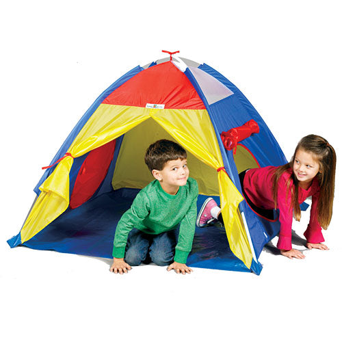 A polyester, flame retardant dome tent with plastic poles for safe, active play... perfect for hide-and-seek fun! Tent features mesh windows on the top, hook and loop closures, 2 awning windows that roll up and tie, and a waterproof ground sheet for outdoor use. Includes a polyester bag with hook and loop closure for easy storage. Complies with CPAI-4 standard. Connects to Tube Travel, Cozy Clubhouse and See Mee tepee.