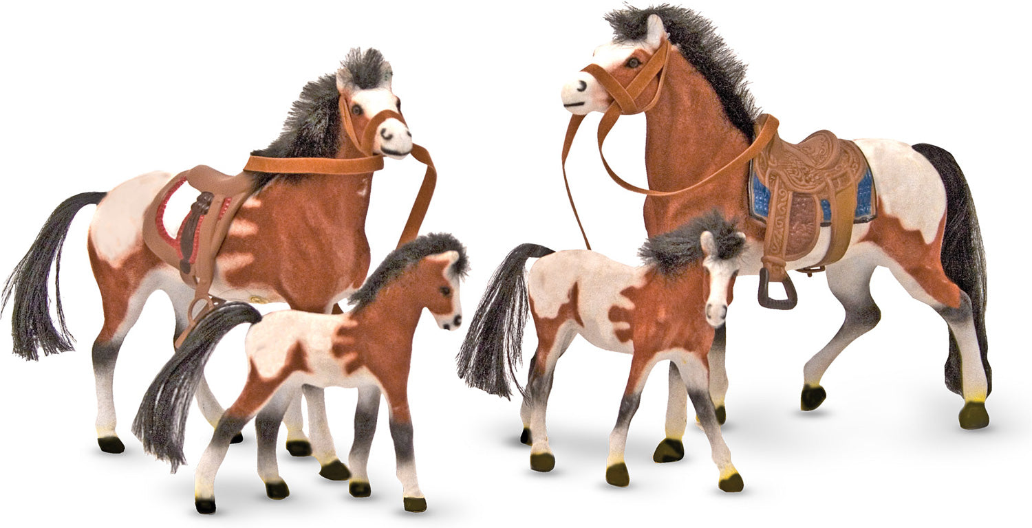 Let your imagination run free with this family of four Appaloosa horses. With velvety texture, dramatic markings, and realistic tails and manes, the two larger horses are saddled up for adventure and the foals are ready to explore.