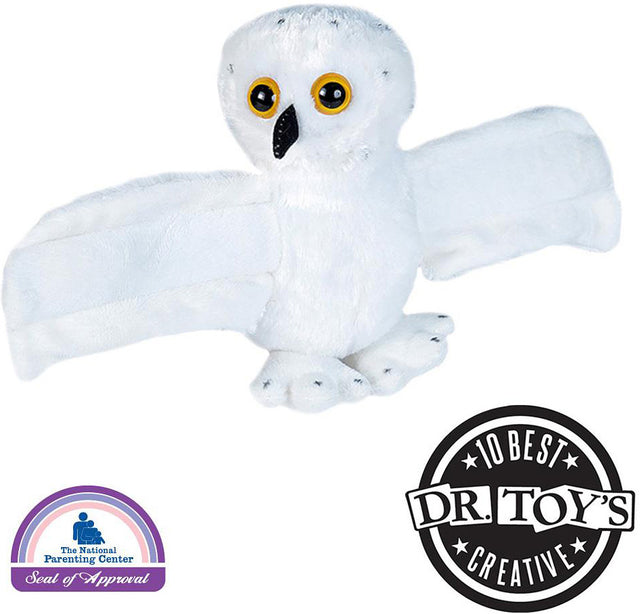 This snowy owl stuffed animal is extra lovable. Just spread his arms wide open. Give his chest a squeeze, then SNAP . . . his arms instantly wrap around and give you a hug. Hugs onto your wrist, backpack, stroller and so much more.
