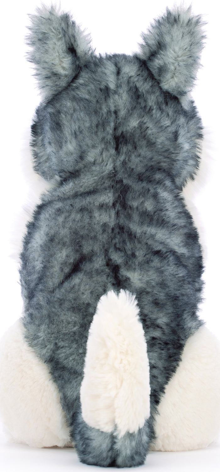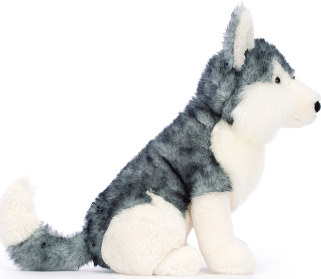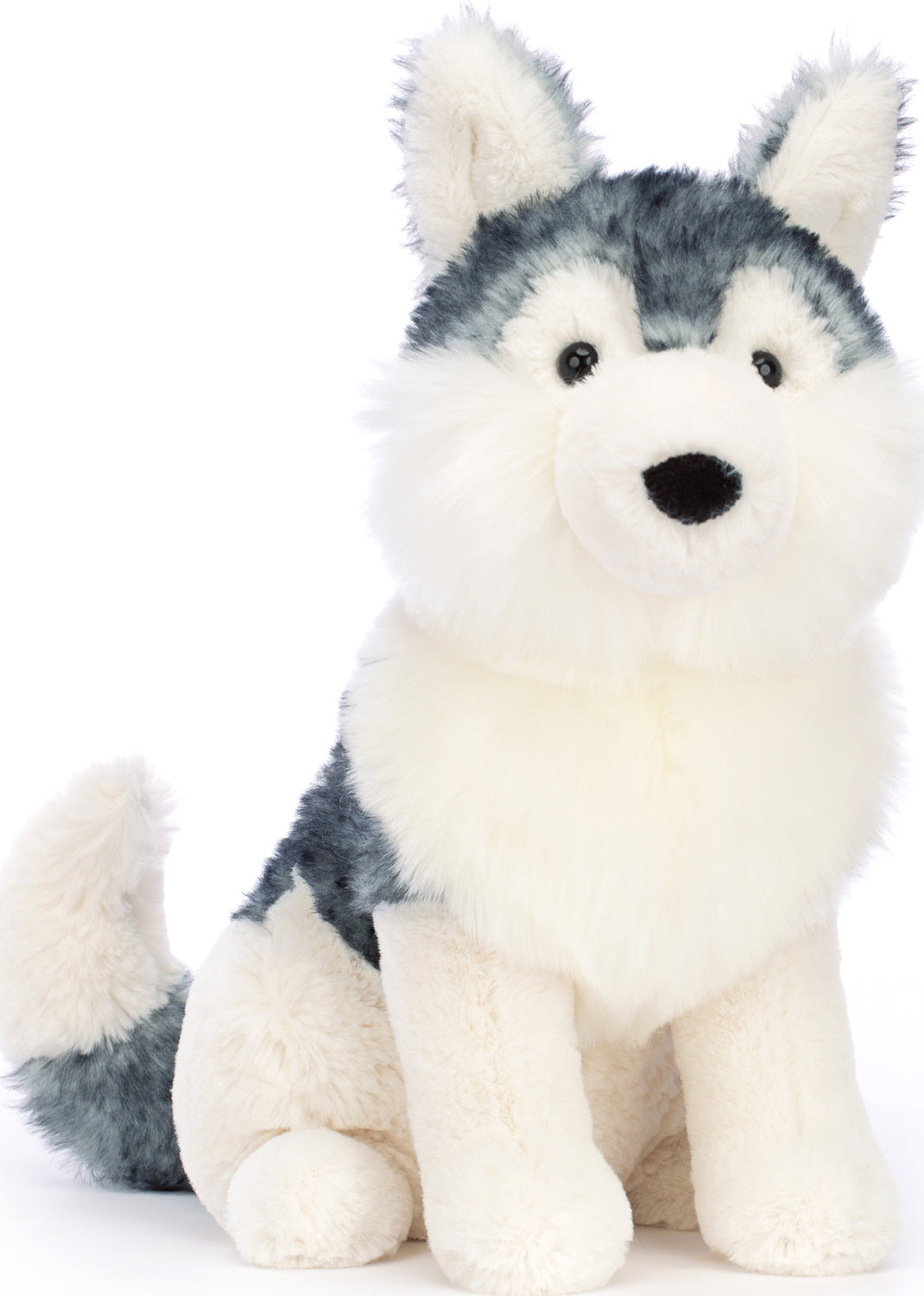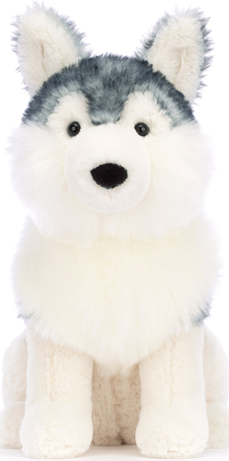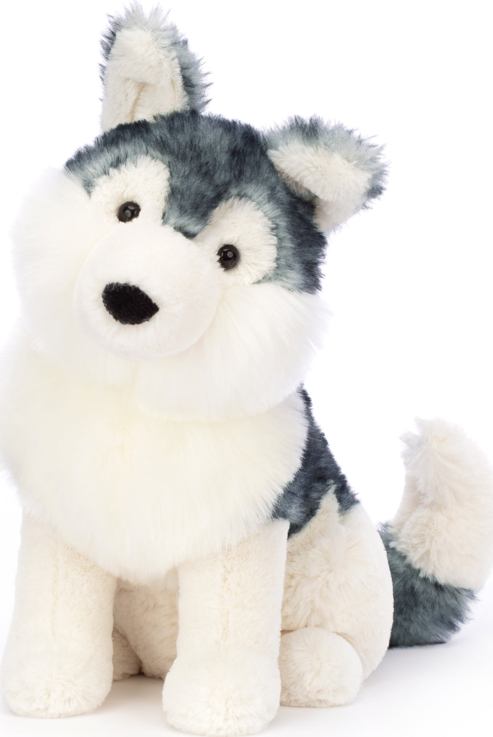 Jackson Husky stays warm in the cold with a silky vanilla ruff. Showing off their blue-grey fur, dandy mask and tufty cheeks and ears, this eager runner is the head of the sled. For now though, Jackson is sitting sweetly on cuddly ice-cream paws.