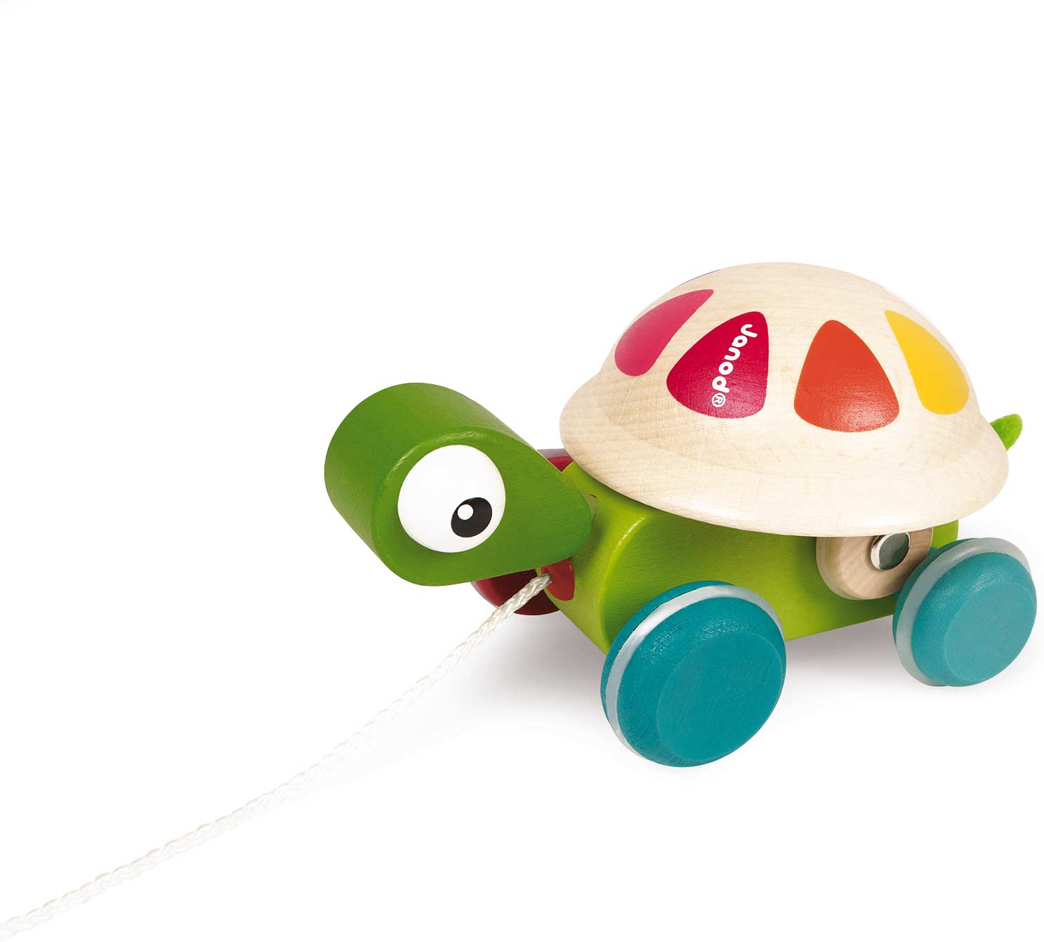 Janod Pull Along - Turtle is a beautifully designed, bright and colorful early learning pull along toy. The turtle's wheels spin its lovely rainbow-colored shell as your child pulls it along. Silent wheels with rubber bands. Recommended for children aged 12-36 months.