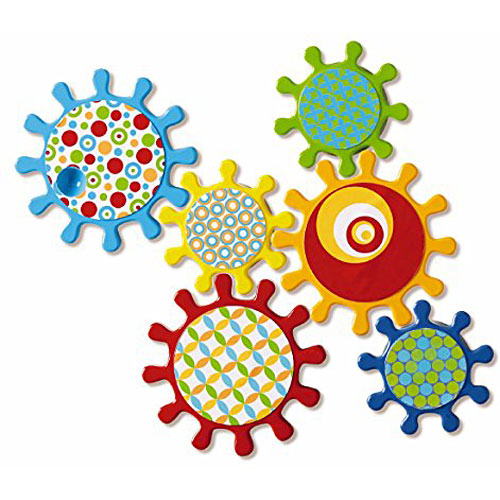 These six colorful gears suction onto most smooth surfaces. They work on tabletop, in the bathtub and on bath tiles, or the refrigerator. Three larger gears and three smaller gears are colorfully decorated and can be arranged in infinite ways. One of the large gears has a special built in finger hold. Crank them up and watch them whirl! Snaps apart for easy cleaning. Small gear measures 3.875" x 0.75" x 3.875". Large gear measures 4.5" x 1" x 4.5".