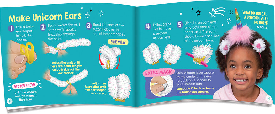 This cool idea book and craft kit lets kids create 3 pairs of animal ears (all the rage these days) to wear as hair clips or on a headband. Decorations galore are included, like bows, puffs, glitter, and, of course, a unicorn horn.