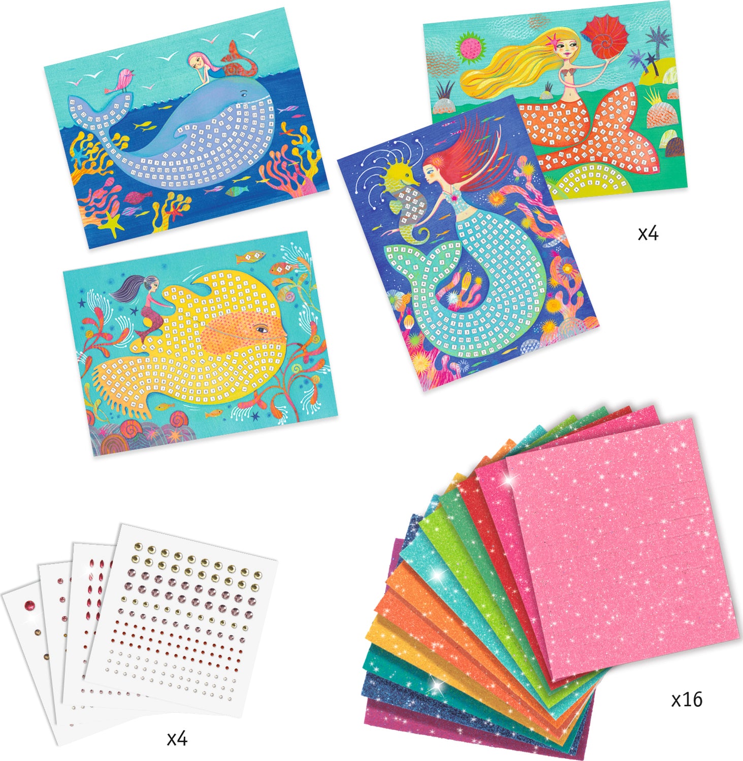 A beginners’ mosaic kit. There are 4 designs to complete with little glittery foam squares and rhinestone stickers. Children look for the numbers, then stick the pieces onto the right places on the board. As the boards are covered in decorations the merm