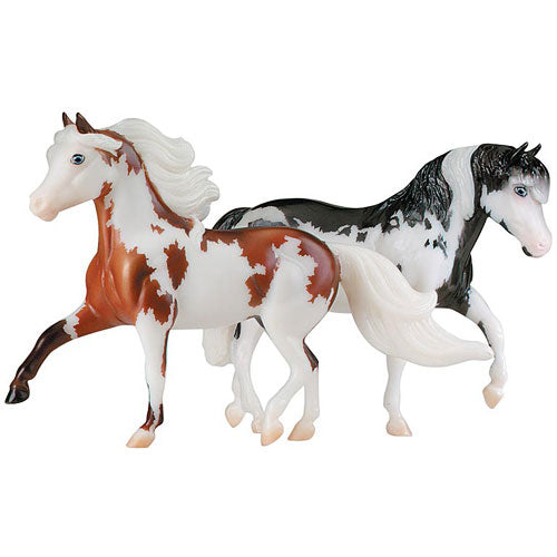This charming set represents two of the "winningest" multi-colored horses in the United States. LTD's Red Cloud is a dazzling and rare red roan medicine hat frame overo stallion; Magic Man's Grand Slam is a black roan medicine hat overo stallion. LTD Miniatures of Greenridge, Missouri, the owner and breeder of these mighty minis, won the American Miniature Horse Registry's 2004 Breeder of the Year award.