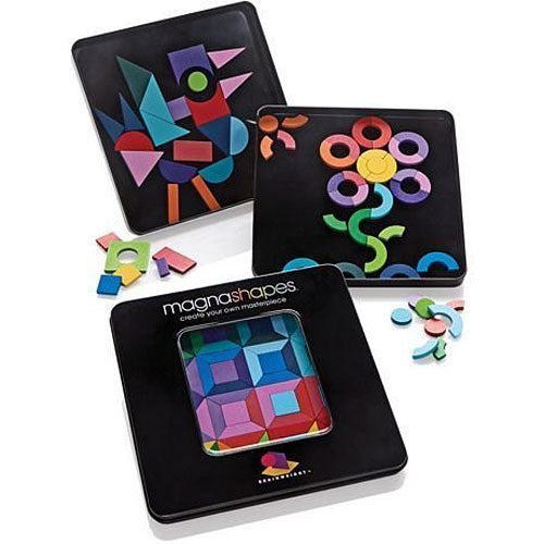 Show off your creative side with this vibrant collection or wooden magnetic shapes. Arrange the shapes to form an unlimited number of geometric patterns. Create your designs right inside the tin or on any metal surface. Includes a guide for 8 colorful patterns.