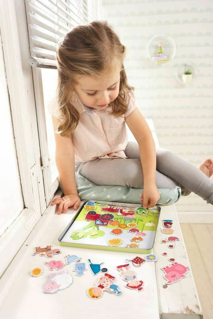 Little farmers will get a kick out of this farm animal-themed magnetic arranging game! Features a variety of background scenes and a plethora of farm inhabitants, animals and plants allowing them to to create and re-create life on the farm. Inspires creativity and imagination. Durable metal tin box makes this perfect for both home and travel fun! Contents: 1 box, 4 background scenes, 122 magnetic puzzle pieces. Material: metal, magnetic foil. Dimensions: box 8.5" x 8.5"