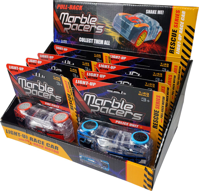 SD Toyz brings you the coolest pull-back engine racer ever with Marble Racers light-up pull-back racing cars! Marble Racers utilize Motion Activated LED lights to bring the coolest blink and flicker light action to your child's racing car playtime. Cars feature an interior marble with the motion-activated LED light inside - give it a shake and the red, blue, green and purple lights flicker and flash as the marble spins!