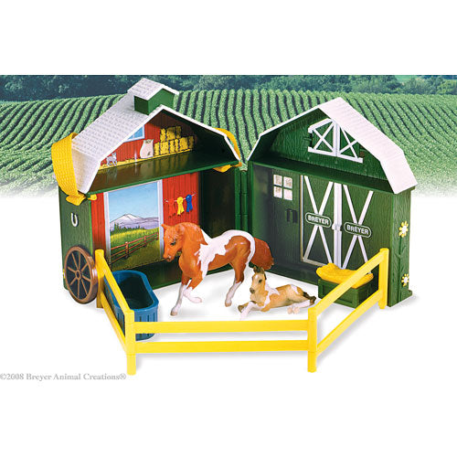 The perfect home for your new Paint mare and foal, the Stablemates Pocket Barn features a carrying strap that lets you take them wherever you go! Set includes corral fencing, water trough and hay manger.