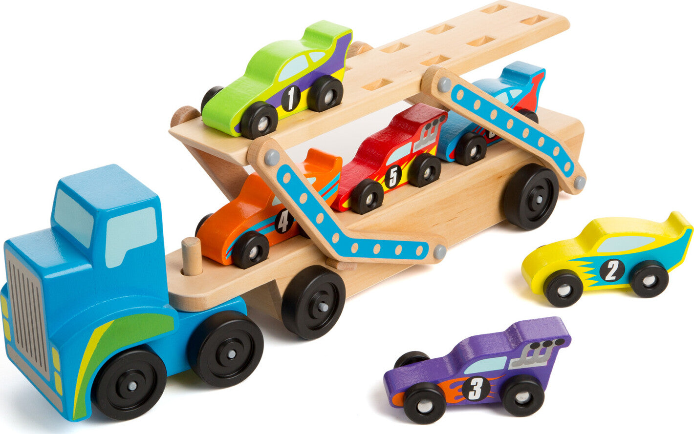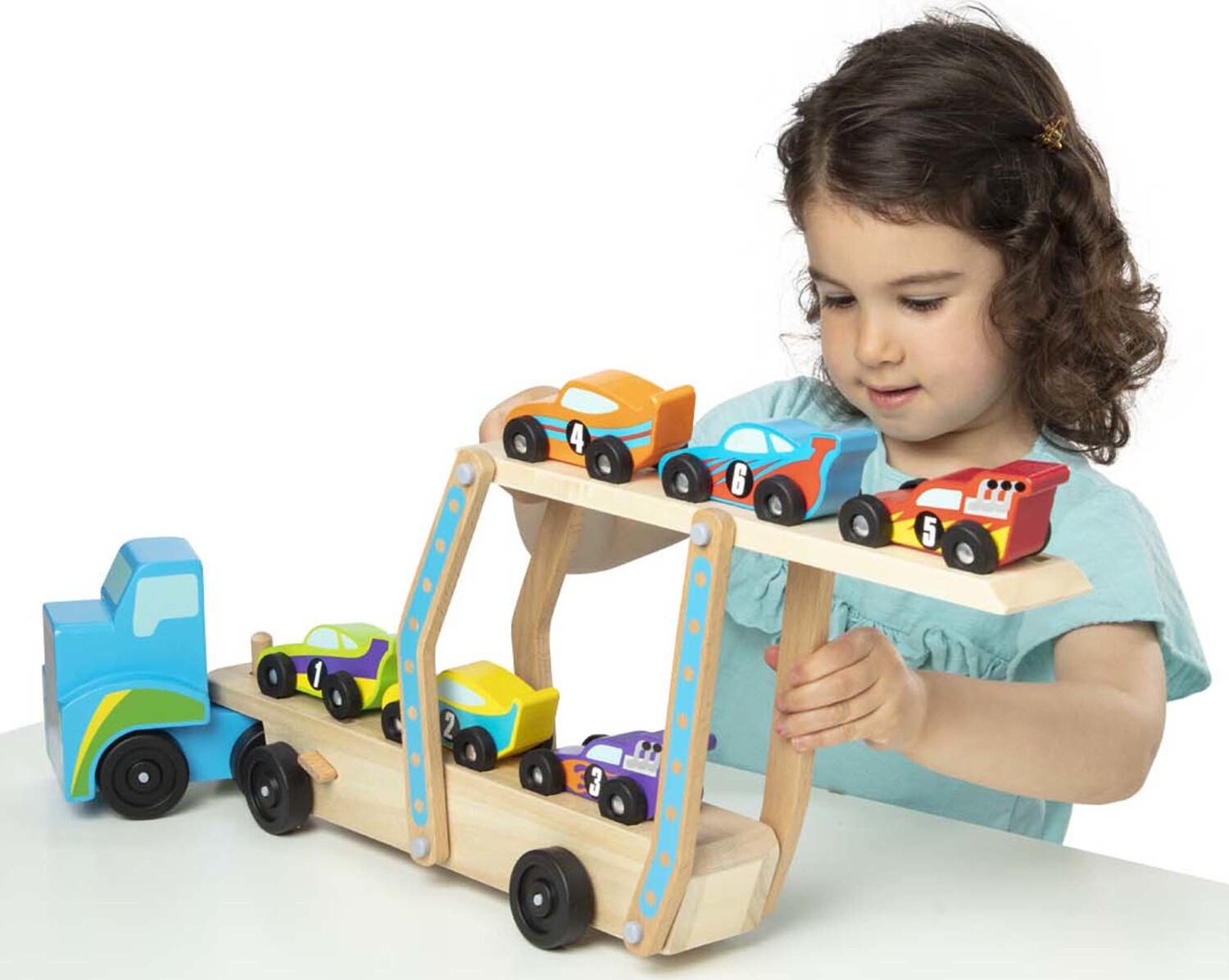 This giant hauler comes stocked with six unique cars and unlimited play possibilities! Lower the upper deck to let the fleet of race cars roll off of the truck and race around-kids will be building motor skills as they play. With a variety of colors, designs, and numbers on the sides, they'll naturally be sorting, sequencing, and grouping, as well, building important cognitive skills too. But ask any kid what's so great about this big truck full of race cars and they'll give you an even better answer: It's huge (2.5 feet when extended) and super cool!