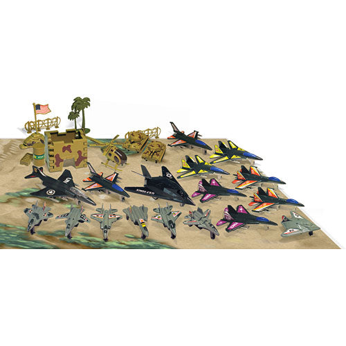 Military Aircraft Play and Store Big Boxes feature new, sleekly designed keepsake tubs with sturdy handles and snap on lids for Take-Along-Fun!. This Military Aircraft adventure includes 17 military style jets, a helicopter, tanks, a full color play mat, and more for hours of imaginative fun. Combine this set with one of our many Bitty Buckets (sold separately) to build even greater adventures.