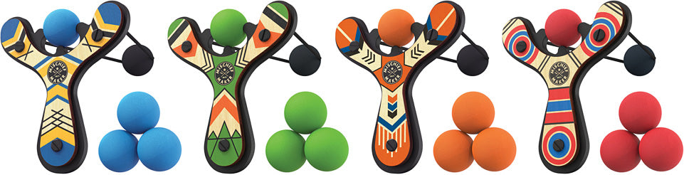 Mischief is so underrated! The soft foam balls give a teasing 'poke' when launched from this foam-and-wood slingshot. The ball stays put until launch, making it easy to use both indoors and out. Set includes slingshot with a cool, classic design, four balls and a storage bag for easy travel. Choose your favorite color and head outside to have a blast. Assorted styles available.