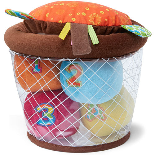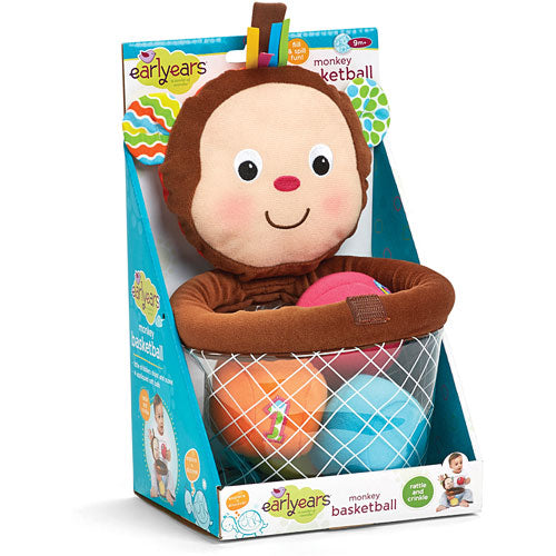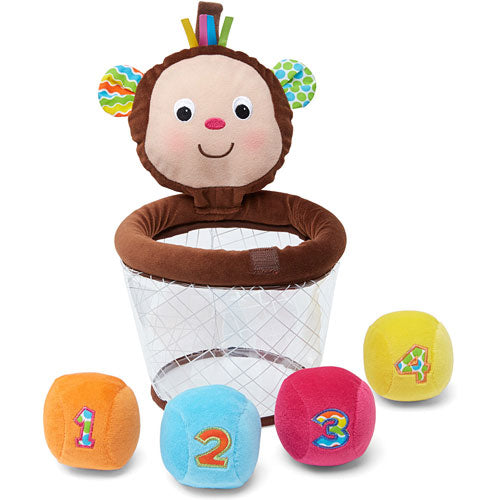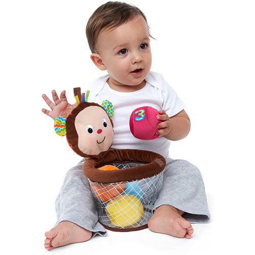 Little dribblers shoot and score! Discover rattle or crinkle sounds in each of the four colorful appliqued soft balls. Monkey's head folds over and closes securely for storage.
