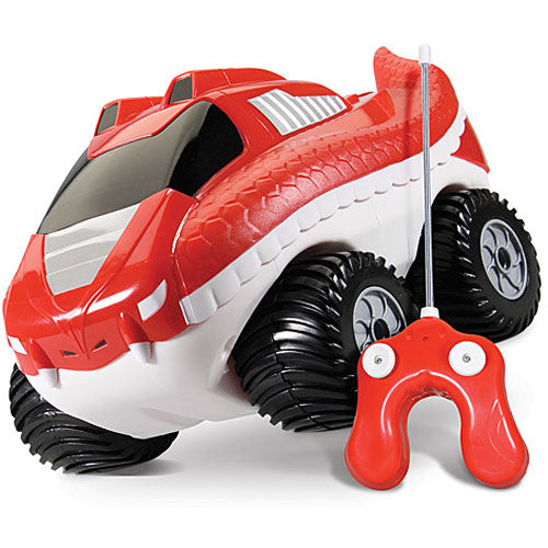 Rule land or water indoors or out! Watch this mean machine with sturdy 4x4 turf digging tires hit pavement, dirt, grass–even pools or ponds, with an unbeatable forward thrust. Full function radio control requires 2 AAA and 3 AA batteries, not included. For ages 5-10 yrs.