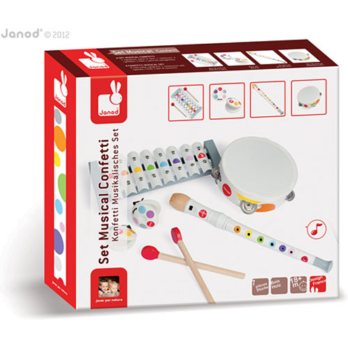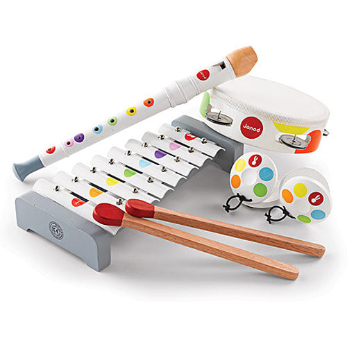 Our set is a fun, colorful ensemble to encourage kids to experiment with sounds, rhythm and melody. Includes recorder, xylophone with wooden mallets, tambourine and castanets. Finely crafted in natural and eco-friendly products by Janod, a specialist in wooden toys for over forty years. For ages 18-36 mos.
