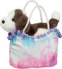 Add a splash of color to your ensemble with our Ombre Clouds Sassy Pet Sak! This alluring handbag’s clouds are depicted with bright pink and blue tie dye patterns. A purple pompom trim adds to its colorful appearance, while two silky twist cord handles provide an easy way to tote your treasures with you wherever you go. Tucked within the purse, a brown and white puppy stuffed animal stands at attention. Her fluffy plush coat features ultra soft materials that will encourage little hands to cuddle and play. Bright, shiny eyes and a flocked nose create her engaging expression. Accessorize with our Ombre Clouds Sassy Sak for an easy way to bring a playful canine companion and a burst of color with you on all your outings!