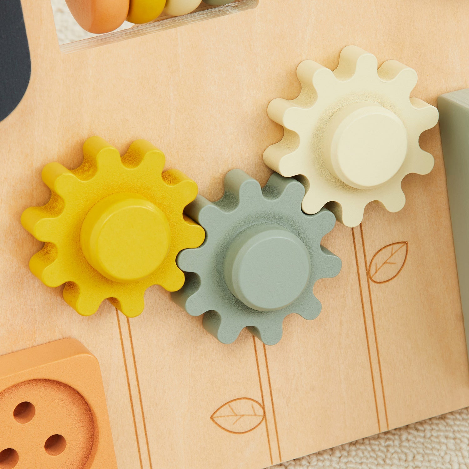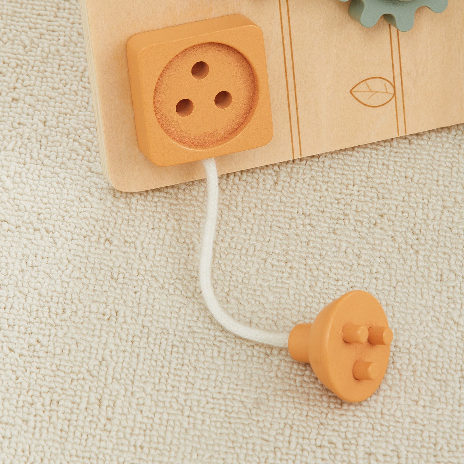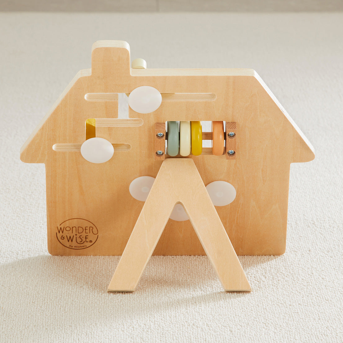 Keep baby busy on the go with a compact, wooden, battery-free Busy Board! Babies and toddlers develop fine motor skills and enjoy tactile stimulation as they explore 6 super fun activities: a maze, abacus, peek-a-boo door with a surprise mirror, gears, switch and 3 prong plug. It's sized perfectly for travel at 11.8" x 2.8" x 12.2", and can be used flat on the floor or table, or propped up using the built-in kickstand.