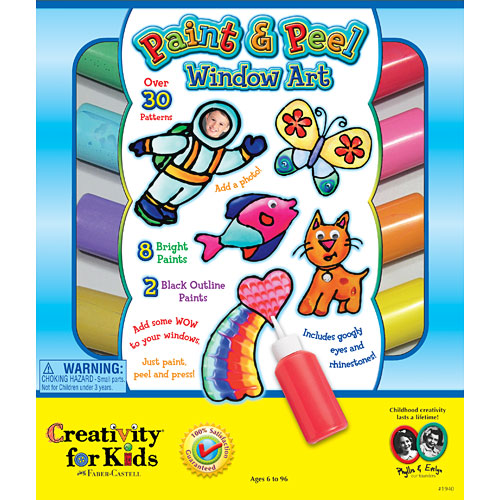 Add some WOW to your windows, -just paint, peel and press them against almost any glass surface. Set features 8 bright window paints, black outliner and dozens of patterns to follow. Extras like rhinestones and wiggly eyes will accent your art.