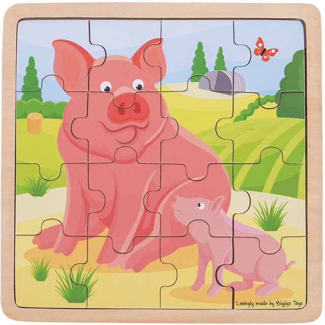 A proud mum and her piglet are cheerfully illustrated in this charming wooden puzzle. Little one's must match each of the brightly colored wooden pieces to the correctly shape slot on the base board. Each chunky puzzle piece is generously sized to make it easier for little hands to lift, grasp, examine and replace. Bigjigs Toys wooden puzzles help to develop vocabulary and aid youngsters to recall words as they recognize shapes, colors and images. Helps to develop dexterity, matching skills and concentration. The wooden base boards of Bigjigs Toys puzzles are printed with images and colors to aid the learning process and add educational value. Made from high quality, responsibly sourced materials. Conforms to current ASTM and CPSIA safety standards. Age 2+ years. Includes 16 play pieces.