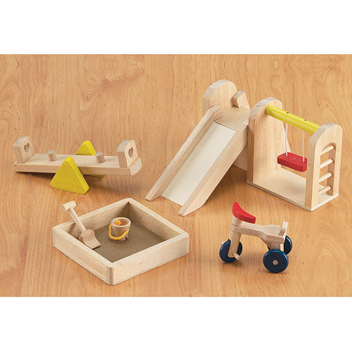 Right outside the doll-house, add a charming playground set and get kids into the swing of things! Fun playground equipment is made of hardwood and detailed with brightly painted accents. Eight-piece set includes swing set with slide-swing-climbing bars, see-saw, tricycle. sandbox, shovel and bucket.