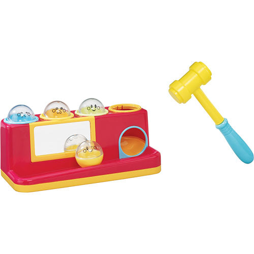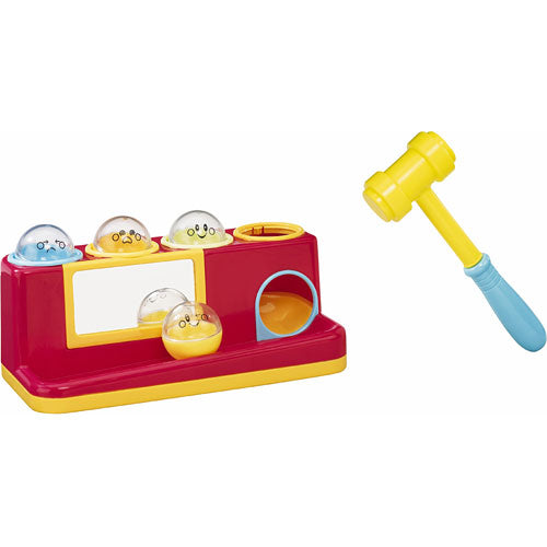 Set includes base, hammer and four balls. Cute face designs on clear side of ball. Color side of ball permits color-sorting activities with the base. Mirror on front promotes self-recognition.