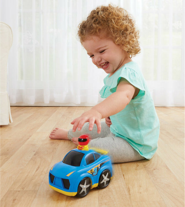 The Kidoozie Press 'n Zoom Race Car features lots of little enticing details. The wheels spin and the spoiler jumps as it rolls. Plus, the driver is sporting his own helmet to drive home the importance of safety behind the wheel. The promise of a driver's license is very far in the future, but they can still get started on their racing career with the Press 'n Zoom Race Car. Just like the fast cars at the track and on the TV, your child can get all the action right from the safety of their home. The Press 'n Zoom vehicles from Kidoozie move without any power source. All you have to do is press the hero's head and watch the vehicle race across the floor. No batteries required! It's the perfect toy that never stops rolling. Kidoozie toys are engaging, educational and FUN. Our broad range of high-quality toys have won numerous awards and are safe and well designed. Innovative toys encourage movement, problem-solving and pretend play through various themes. Stimulate the imagination and enable learning through play. Package contains (1) Kidoozie Press 'n Zoom Race Car with press and go action. Features moving spoiler, peek-a-boo head, and spinning wheels. No batteries required. Recommended for children ages 12 months and older.