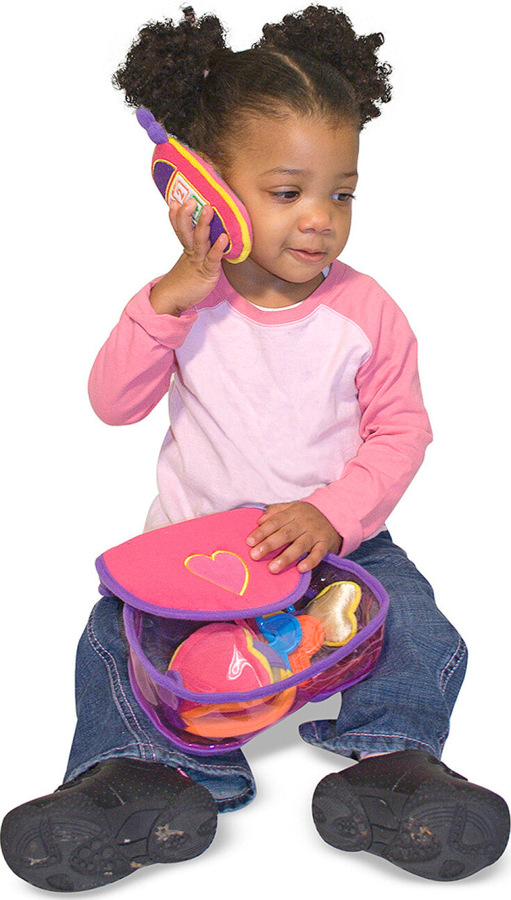 Everything necessary for the little girl on the go fits into this pretty purse! This soft play set includes a cell phone that chimes, a key ring with keys, a change purse with coins and a compact with a child-safe mirror. Everything is easily removed and replaced into a charming pink purse with a purple handle. Constructed of high-quality fabrics and plastic, this durable set will provide hours of pretend fun!