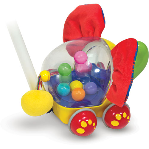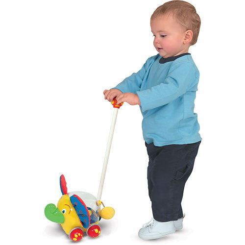 Set off a rainbow of pops with every step! This sweetly styled push toy rolls forward and backward with ease-and puts on its clicking, clacking, popping show in either direction. Easy to clean and built to last, this sturdy plastic walker helps toddlers improve gross motor skills and walking, encouraging each step with a chorus of color and sound. The soft rubber handle is easy to grasp, squeeze, and hold, and the push stick is angled to offer the most beneficial experience for early walkers. Children will delight in pushing this cheerful elephant around the house and playing with the multi-textured, multisensory elephant at its base-complete with crinkly ears and a padded bell tail that bumps and jingles. Melissa & Doug K's Kids toys nurture early childhood development in three key skill areas: Physical, cognitive, and social. With interactive designs and multisensory features, K's Kids promotes constructive play and effortless learning, keeping interest high and new skills flourishing throughout the baby and toddler years!