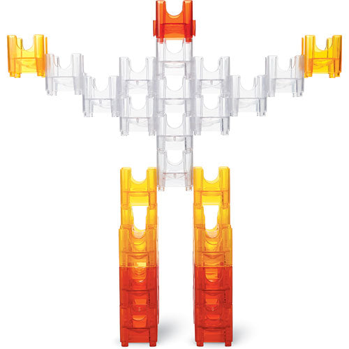 Every dinosaur, robot, flower, fish, sun or tower is a working marble maze! Inspire creative play by building the amazing marble run sculptures in the idea book or make up your own! The Warm Colors Starter Set includes high-quality red, clear and yellow blocks.