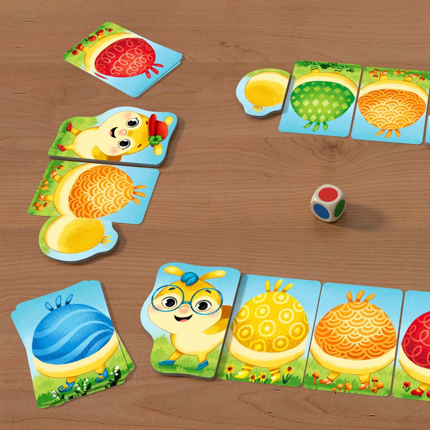 Which colors and patterns will be discovered as they build? The child whose caterpillar is the first to be as colorful as a rainbow wins.