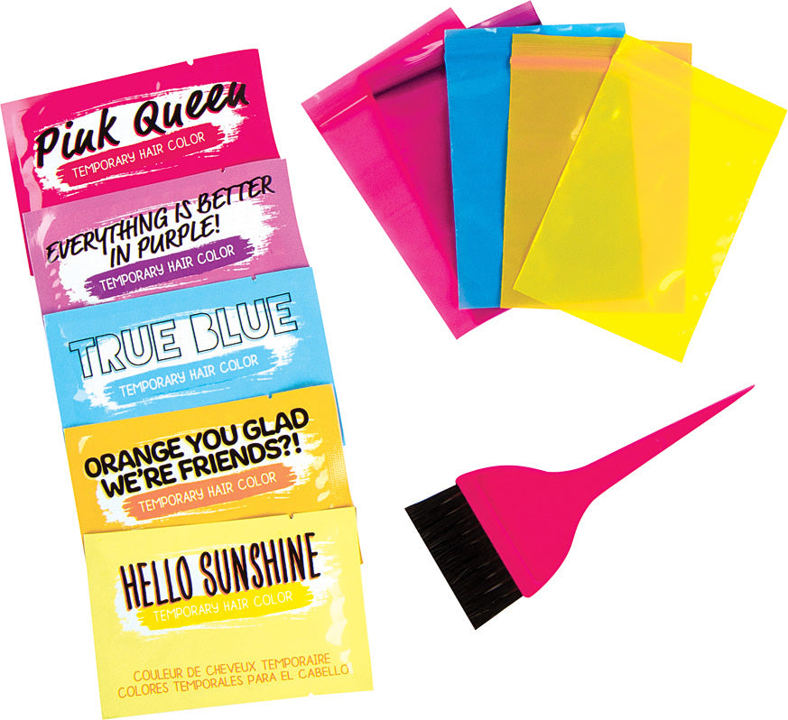 The fashion-conscious love expressing themselves with color! Sleepovers and spa days have never been more fun with this bright, safe, and best of all temporary hair color. Painting it on is easy and returning to natural color is just a shampoo away. Pink, orange, yellow, blue and purple powders produce a pretty rainbow effect that washes out with ease.