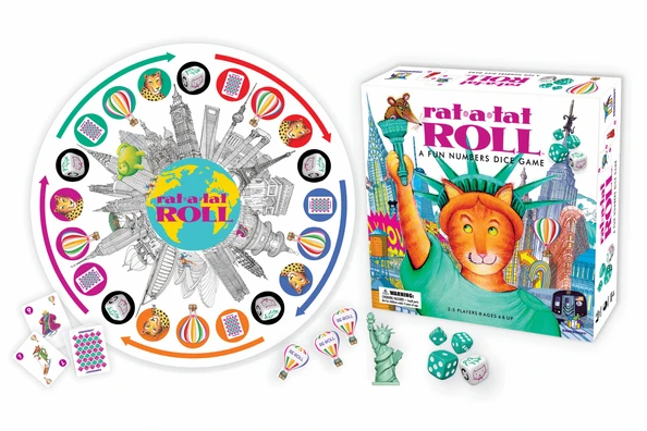 Roll around the world with Rat-a-Tat Cat! The best-selling game returns with a fresh new spin - dice! Move around the board trying to collect low cards (cats) while avoiding high cards (rats). Choose one, two, or three dice, keeping re-roll tokens handy in case you miss your mark. All along, look out for peeks, swaps, and especially the chancy “wild” spots, where things could really get dicey! Get the lowest score and Rat-a-Tat Catapult to victory!