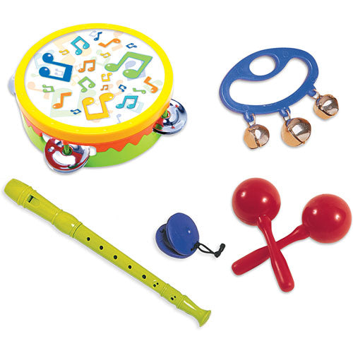 Set includes: 5 - Colorful musical instruments; Recorder, Tambourine, Maracas, Jingle Bells and Castanet.